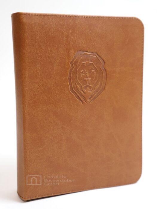 Die neue Life Lion Bibel (hier ohne Namensprägung) mit breitem Rand für Notizen, flexiblem Kunstledereinband, Stiftlasche, Reißverschluss und 2 Lesebändchen, 32 Farbseiten / 16 Seiten farbige Karten und Zeittafeln. Als Übersetzung wurde die NeÜ bibel.heute gewählt mit ihrer klarer Orientierung am Grundtext und ihrer prägnanten Sprache.